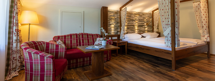 The Löwen-Perle is our absolute insider tip for a great vacations - a junior suite with 36 sqm. It has an attic, a romantic four-poster double bed and inviting sitting area. The beautiful balcony with a view of the river Murg makes your holiday perfect.